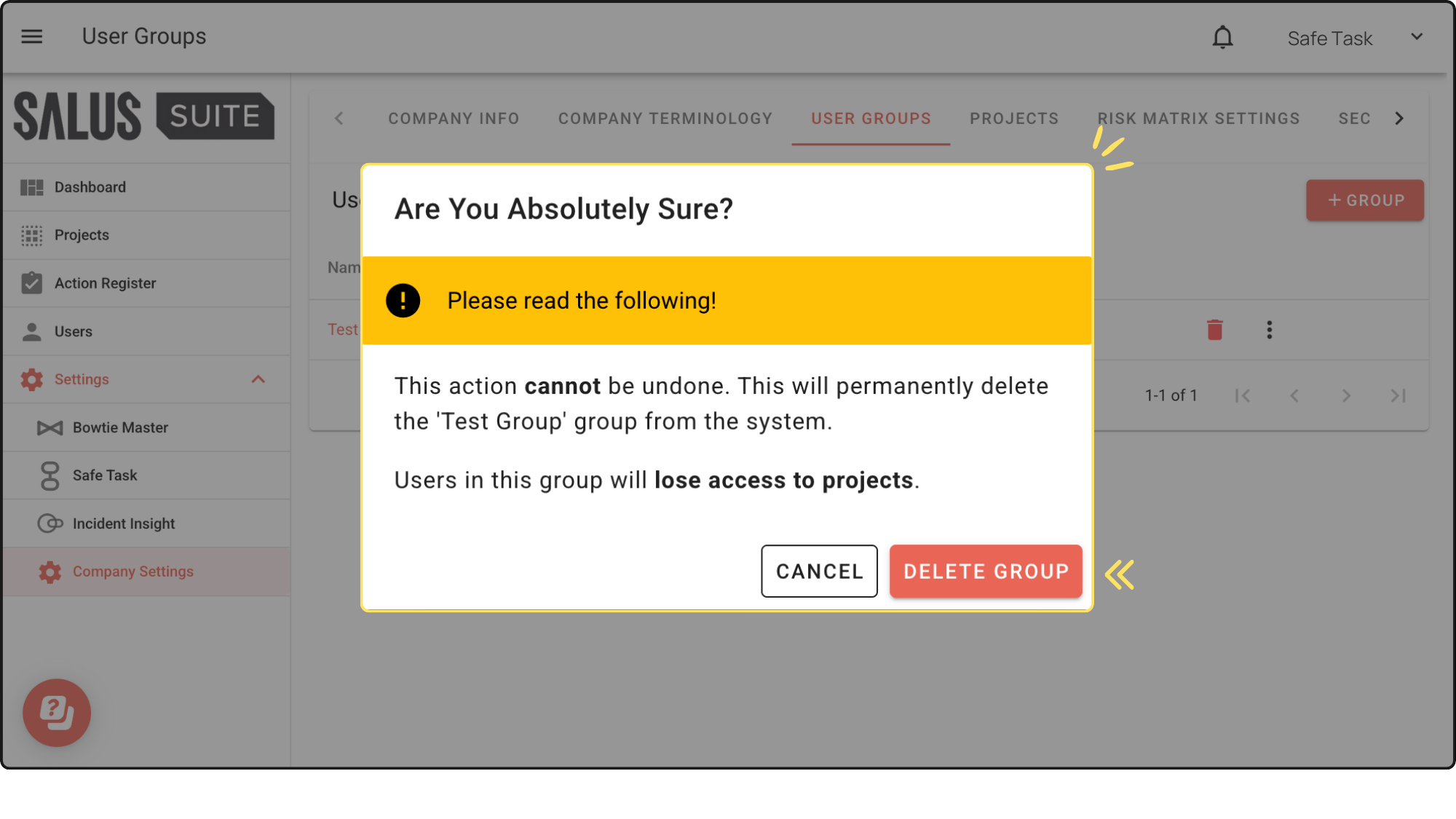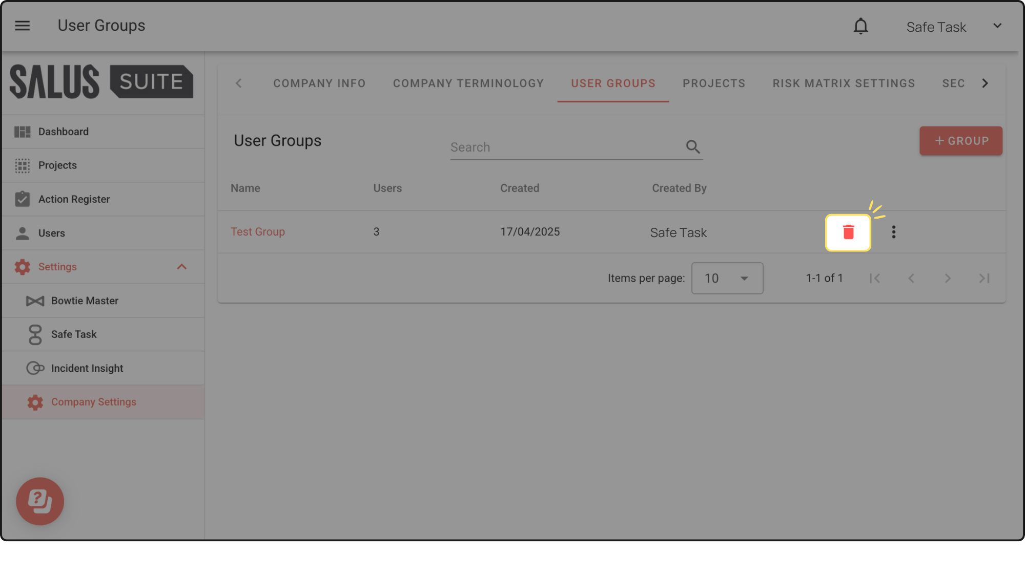 Step 1: In the User Groups menu, click the Bin icon to delete a group.