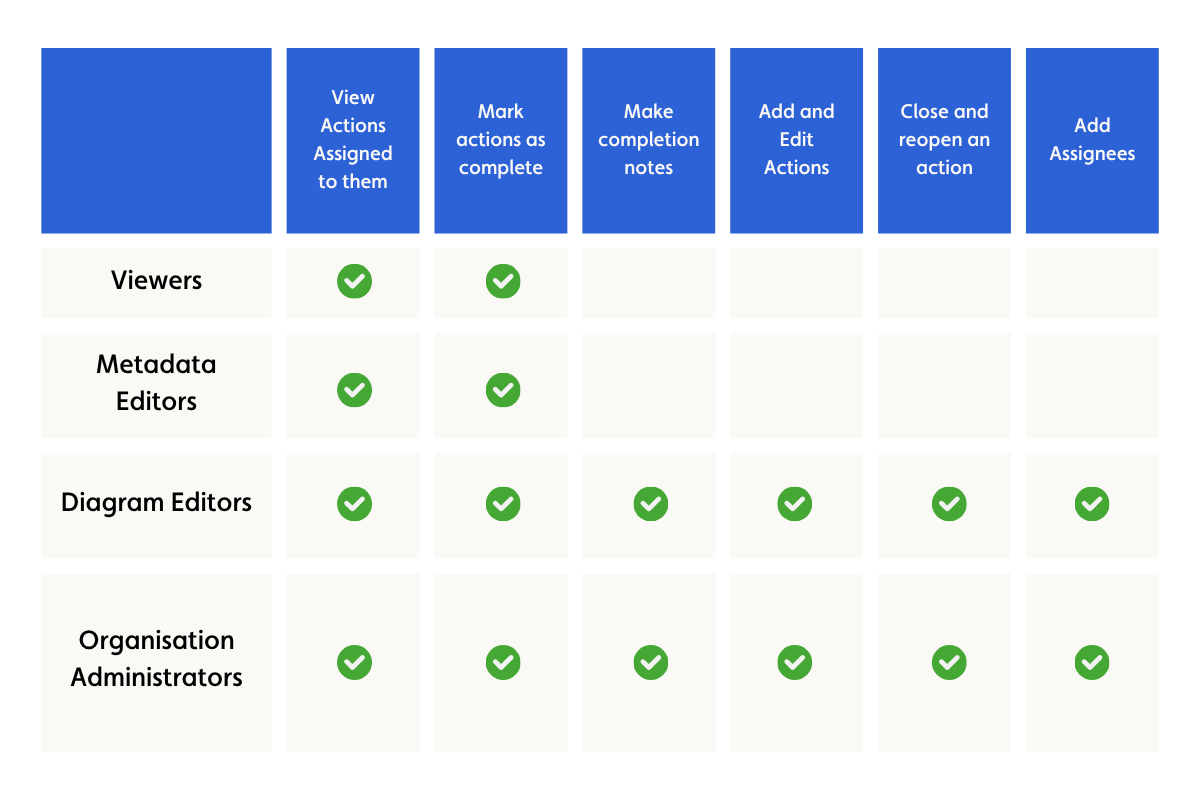 Once an action is created, only Organisation Administrators, the Action Owner (either the Organisation Admins or a Diagram Editor), or Diagram Editors with granted access can edit its contents.