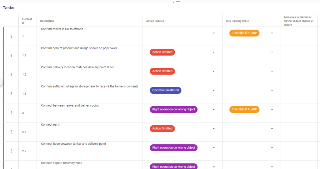 Safe Task allows you to create HTA diagrams with different layouts. You can choose between two different ways of visualising the tasks: either in a table or as a hierarchy of boxes connected by lines (a hierarchical tree). When working with the hierarchical tree, you can show or hide the task levels as necessary. The table view shows further information with drop downs or additional text can be shown or hidden. Showing the steps with numbers makes it easier to see the sequence of tasks as they are moved around, this feature is optional on the hierarchical tree.